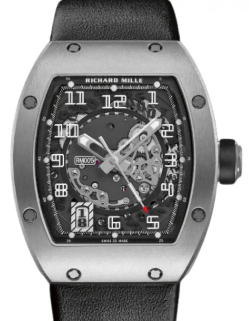 This certified authentic Used Richard Mille Automatic 2004 Watch, with the Model Number: RM005, has a Titanium 38 mm Tonneau (Rectangle) Case with Screw Down Crown and a . This Men’s Richard Mille Automatic 2004 has an attractive Skeleton Dial with Arabic Dial Markers. The certified Swiss tested Richard Mille Automatic Movement will keep perfect time for you. The elegantly designed Richard Mille with Tang Buckle will look great on your wrist. Richard Mille Automatic 2004 Titanium Skeleton Arabic Dial 38 mm RM005