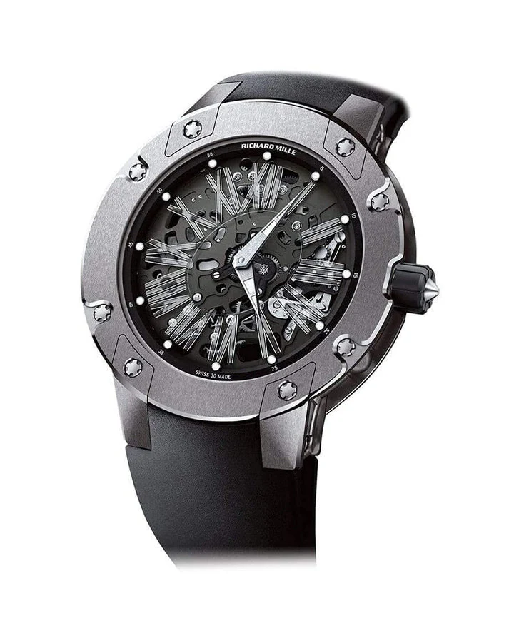 The RM033 features a titanium round case that is both lightweight and exceptionally strong. Titanium is favored in high‑end watchmaking for its resistance to corrosion and its ability to withstand daily wear while remaining comfortable on the wrist.